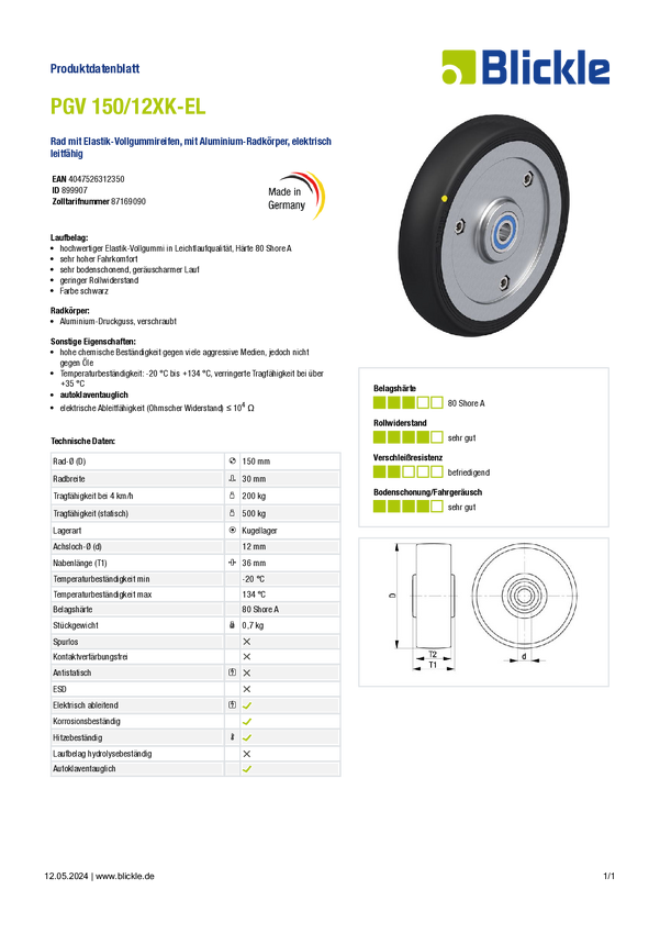Blickle 899907 PGV 150/12XK-EL Koło Średnica koła: 150 mm Maksymalne obciążenie: 200 kg 1 szt.