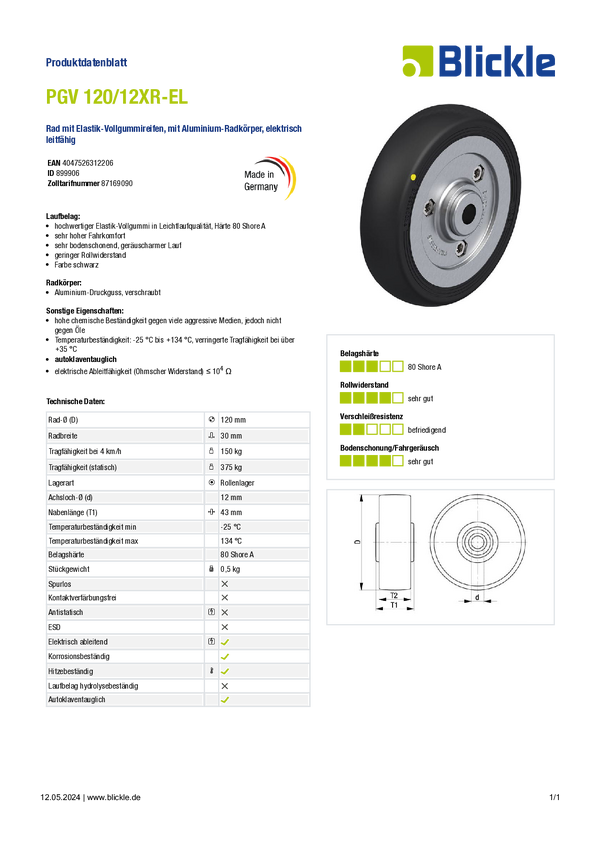 Blickle 899906 PGV 120/12XR-EL Koło Średnica koła: 120 mm Maksymalne obciążenie: 150 kg 1 szt.