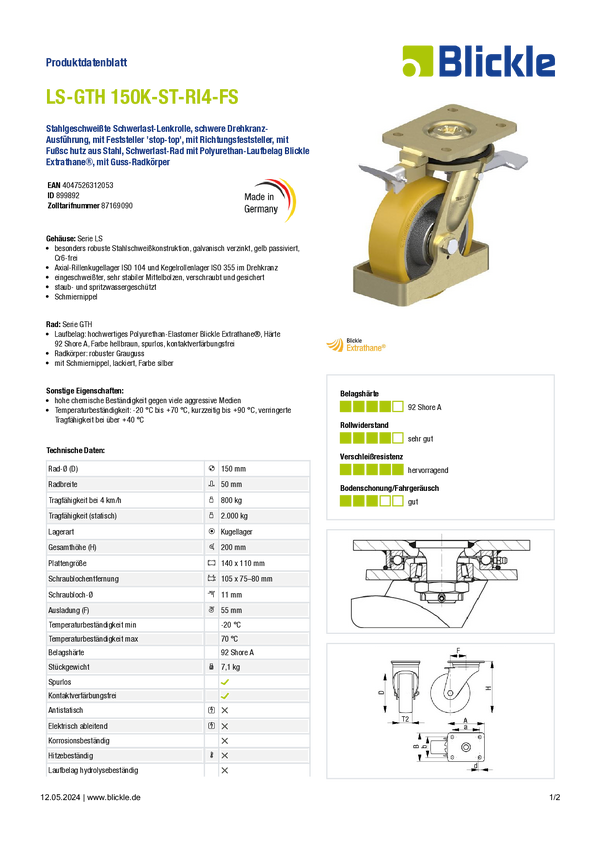 Blickle 899892 LS-GTH 150K-ST-RI4-FS Koło obrotowe do dużych obciążeń Średnica koła: 150 mm Maksymalne obciążenie: 800 k