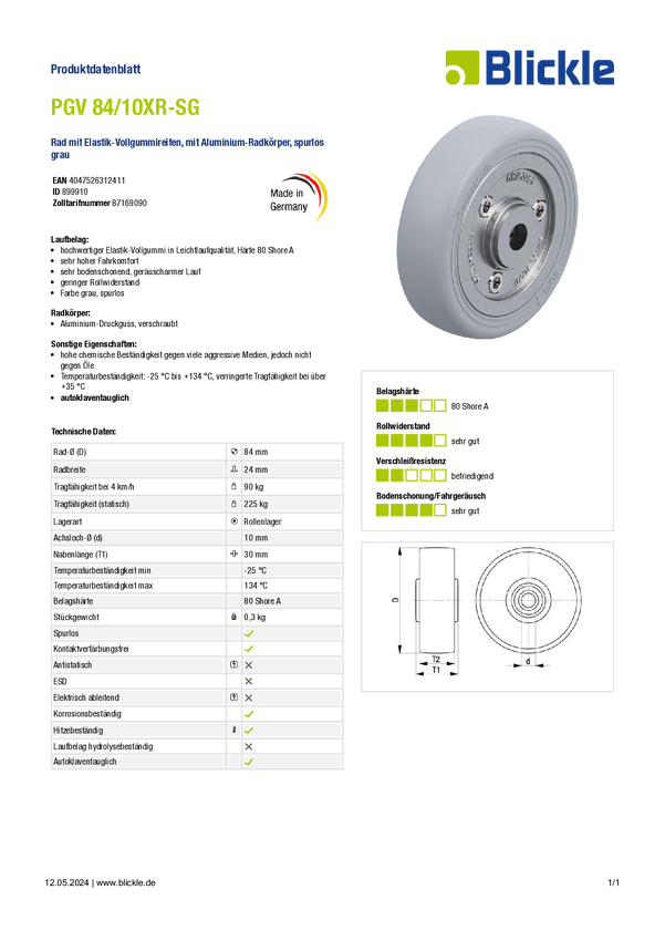 Blickle 899910 PGV 84/10XR-SG Koło Średnica koła: 84 mm Maksymalne obciążenie: 90 kg 1 szt.
