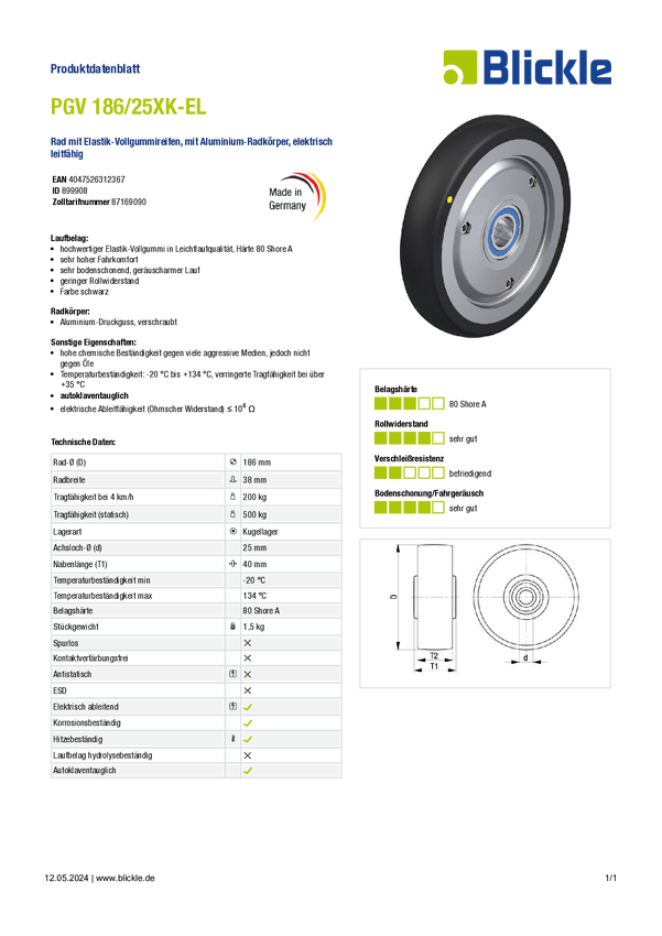 Blickle 899908 PGV 186/25XK-EL Koło Średnica koła: 186 mm Maksymalne obciążenie: 200 kg 1 szt.