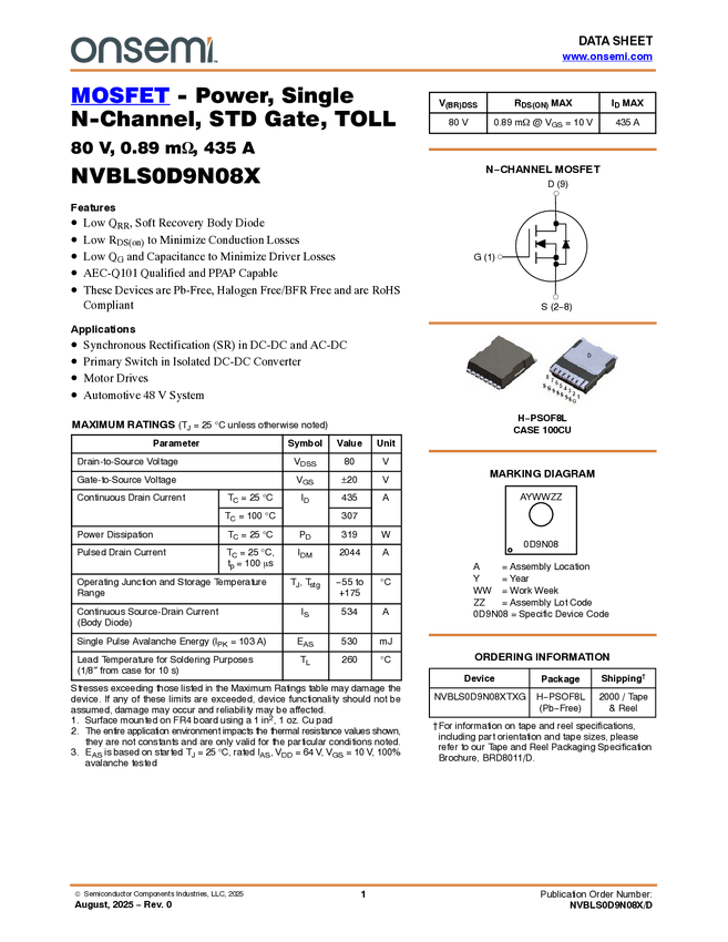 N-Channel PowerTrench® T10 MOSFET, 80V, 435A, 0.89mΩ