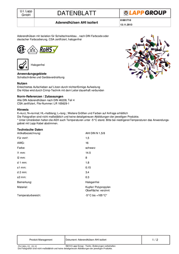 LAPP 61801710 Końcówka rurkowa AHI DIN N1,5/8BK, z częściową izolacją , 1.5 mm² x 8 mm, 500 szt.