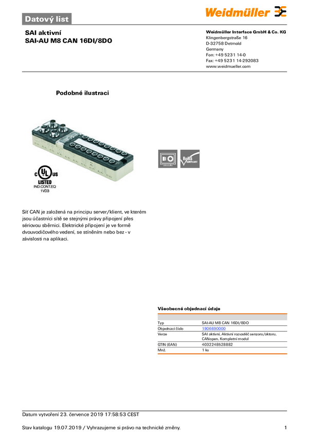 Rozdzielacz czujnik / element wykonawczy, aktywny Weidmüller SAI-AU M8 CAN 16DI/8DO 1906690000 1 szt.