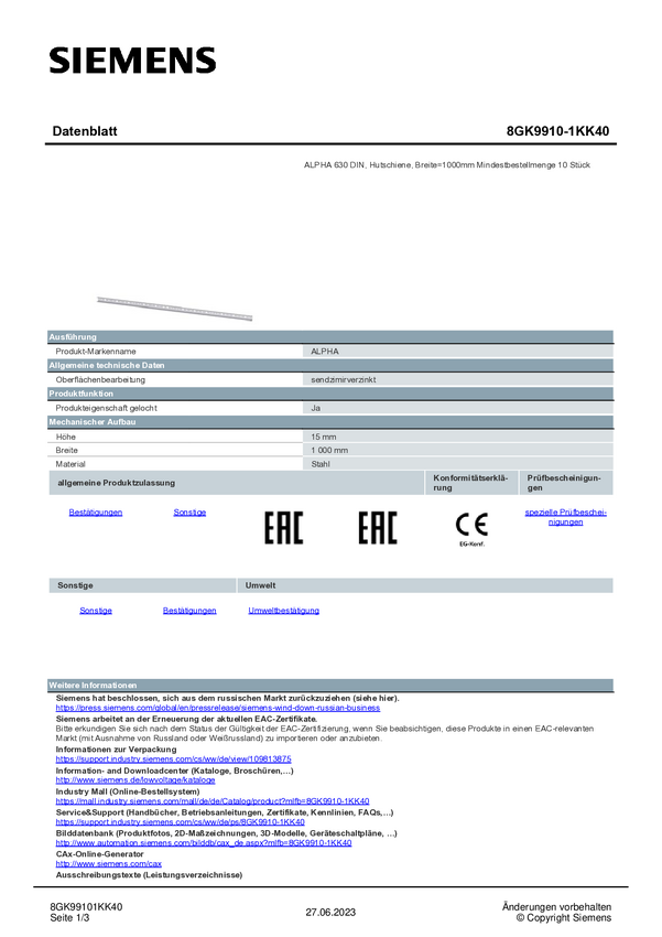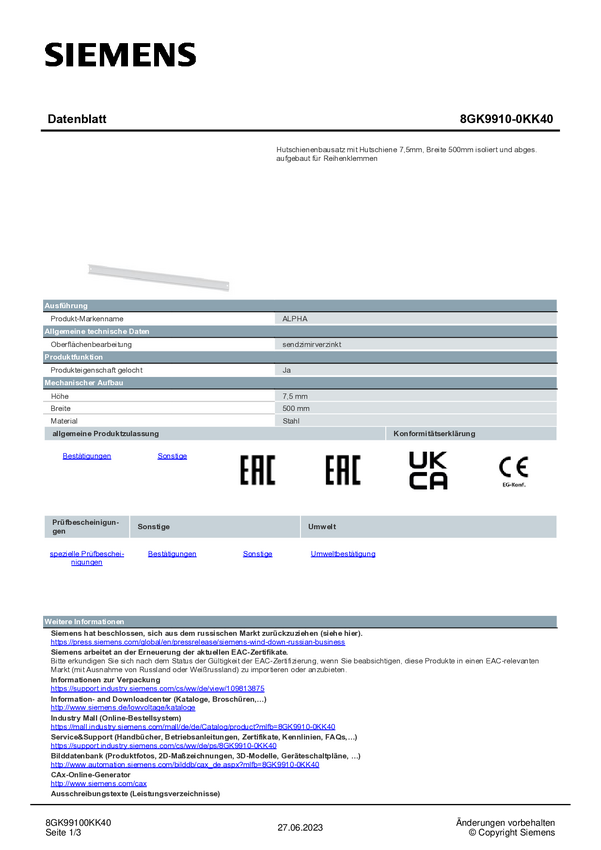 Zestaw na szynę DIN Siemens 8GK9910-0KK40 1 szt.