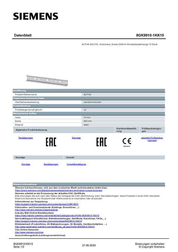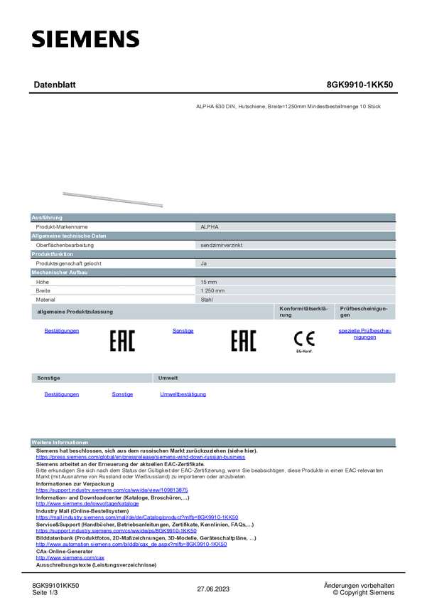 Szyna Siemens 8GK9910-1KK10 10 szt.