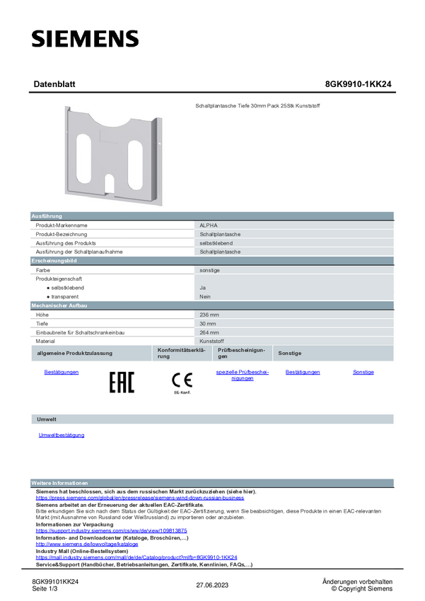 Kieszeń na schemat połączeń Siemens 8GK9910-1KK24 8GK99101KK24, 25 szt.