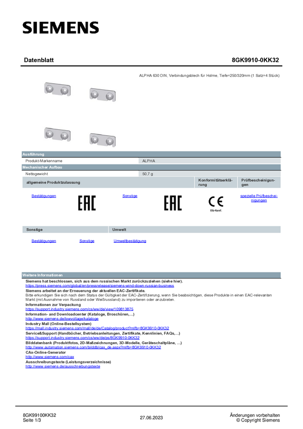 Płyta łącząca Siemens 8GK9910-0KK32 1 szt.