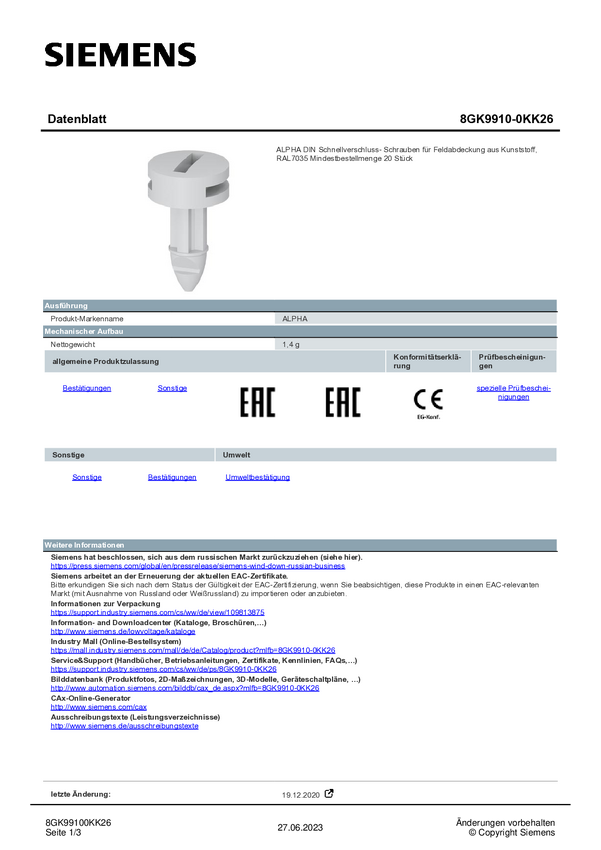 Pokrywa Siemens 8GK9910-0KK26 20 szt.