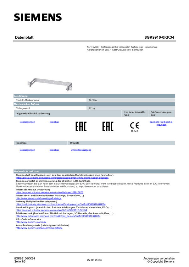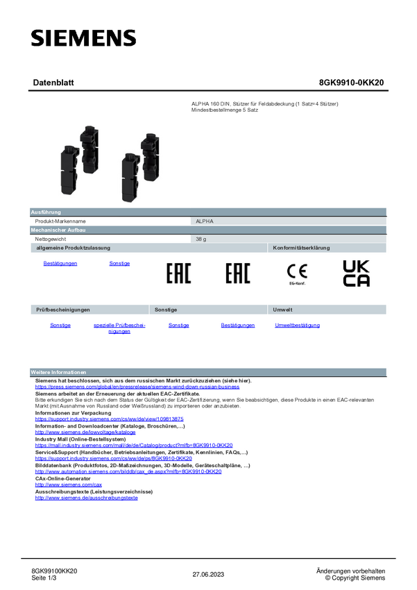 Wspornik inżynierii lądowej i wodnej Siemens 8GK9910-0KK34 1 szt.