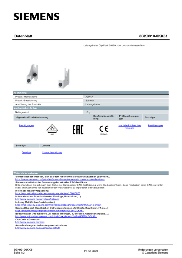Uchwyt przewodu Siemens 8GK9910-0KK81 200 szt.