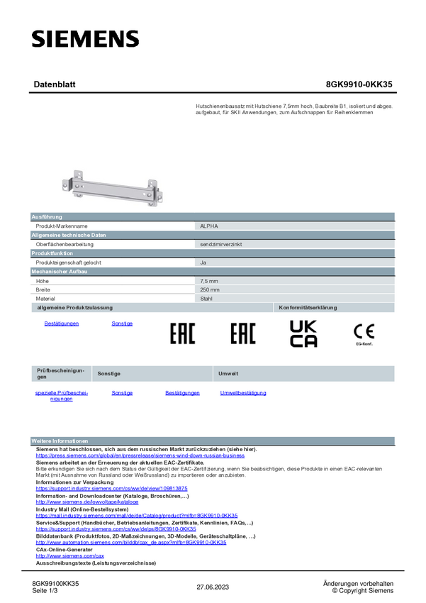 Zestaw na szynę DIN Siemens 8GK9910-0KK35 1 szt.