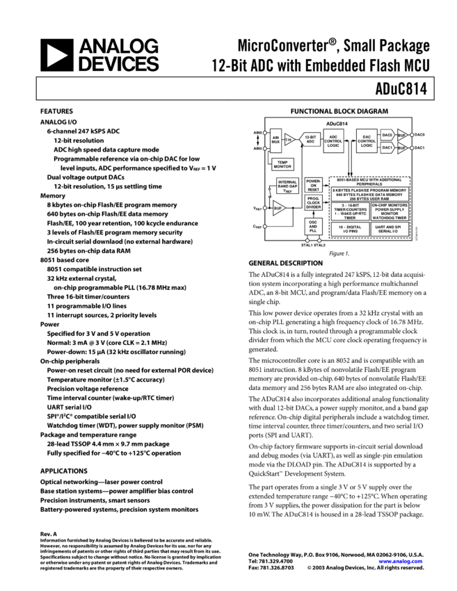 ADUC814: Precision Analog Microcontroller: 1.3MIPS 8052 MCU + 8kB Flash + 6-Ch 12-Bit ADC + Dual 12-Bit DAC