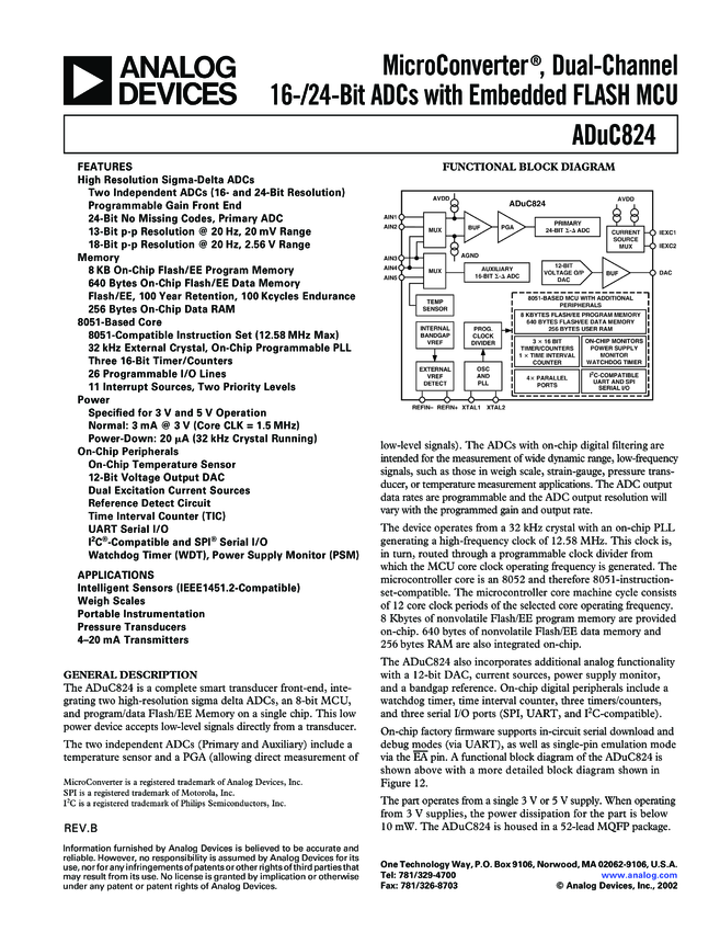 ADUC824: Precision Analog Microcontroller: 1MIPS 8052 MCU + 8kB Flash + 16/24-Bit ADC + 12-Bit DAC