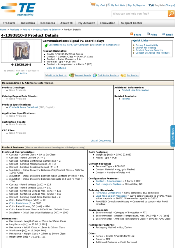 Electromechanical Relay 4PDT 2A 72VDC 5.8KOhm Through Hole
