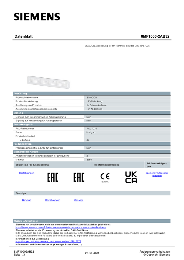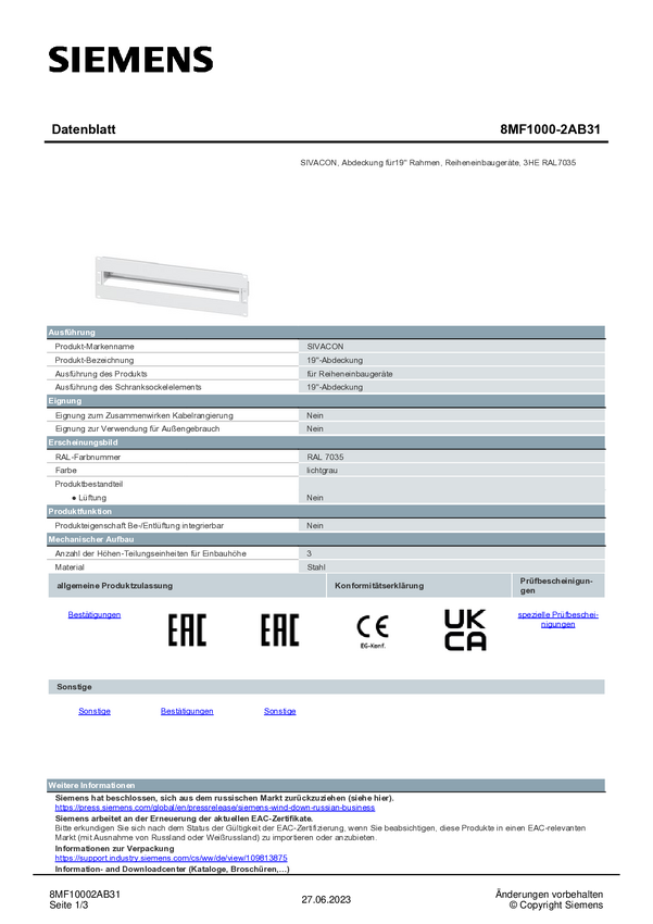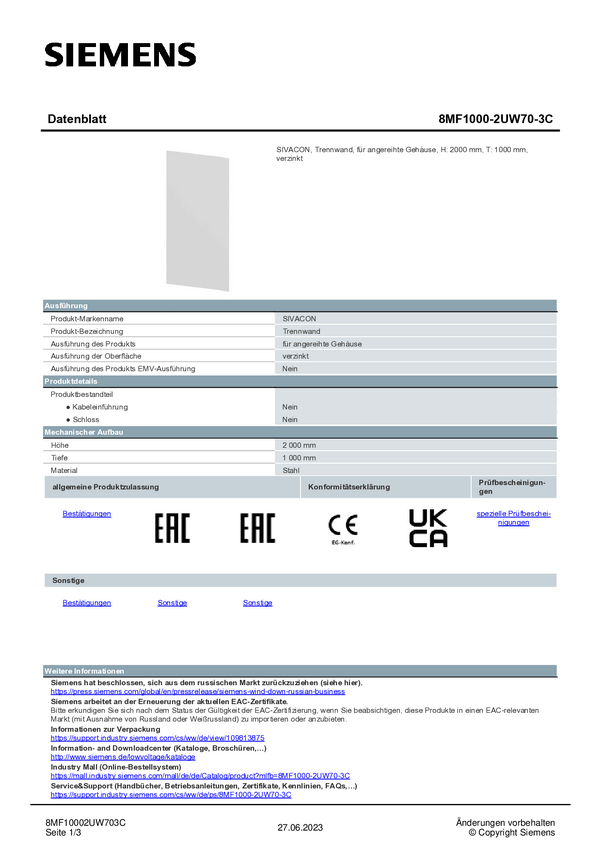 Ścianka działowa Siemens 8MF1000-2UW70-3C 1 szt.