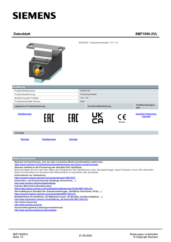 Przełącznik pozycji drzwi Siemens 8MF1000-2VL 1 szt.
