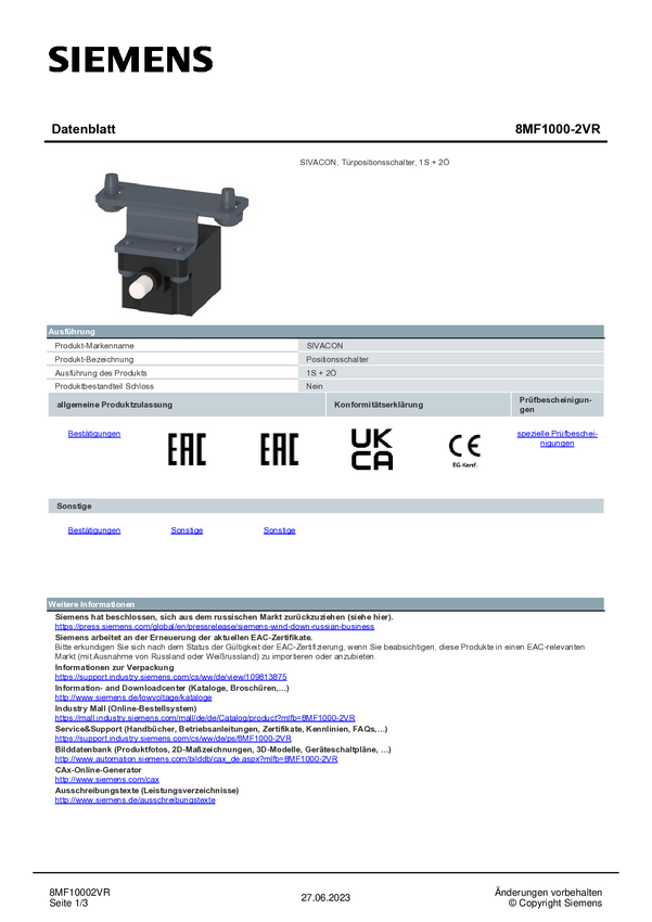 Przełącznik pozycji drzwi Siemens 8MF1000-2VR 1 szt.