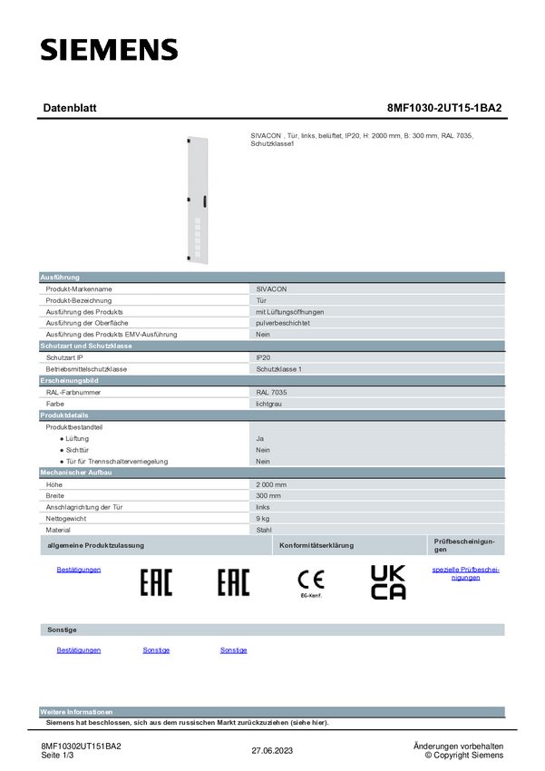 Drzwi Siemens 8MF1030-2UT15-0BA2 1 szt.