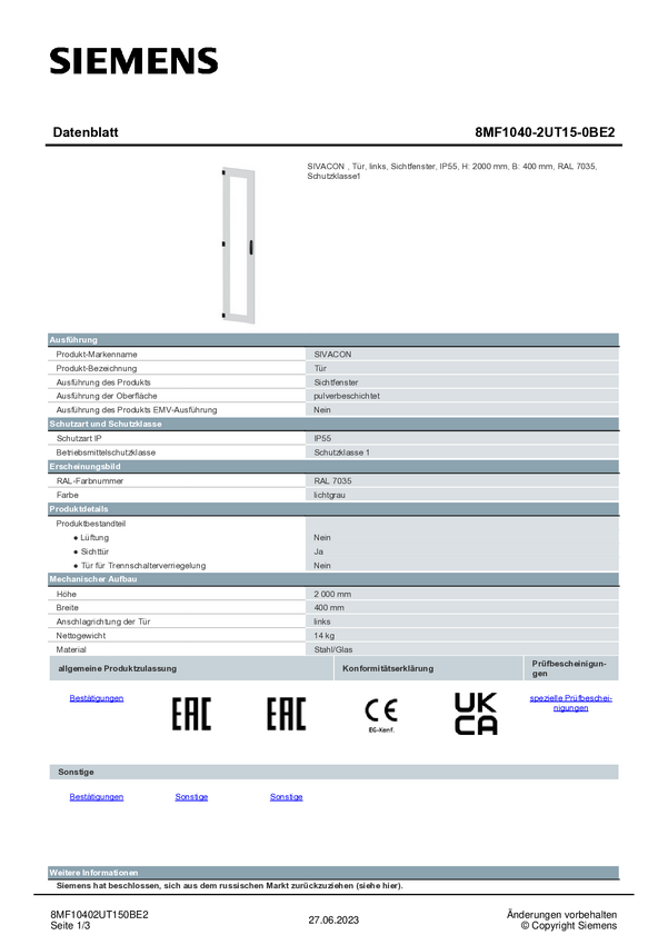 Drzwi Siemens 8MF1040-2UT14-0BA2 1 szt.