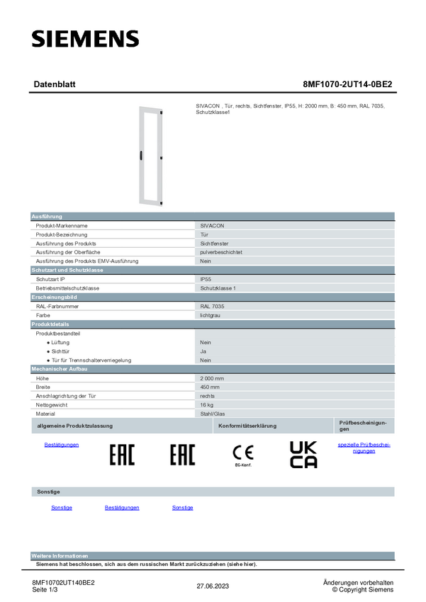 Drzwi Siemens 8MF1070-2UT14-0BE2 1 szt.