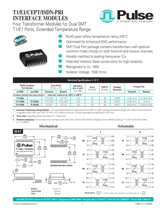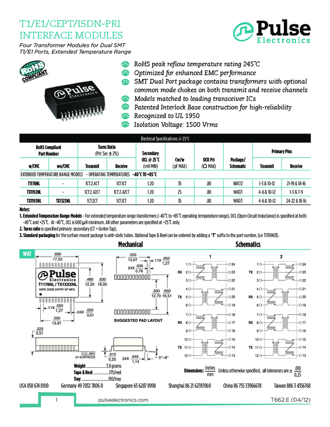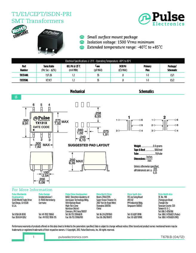 Pulse Transformer 4000Vrms 1.8Ohm Prim. DCR 12pF 50Vus Surface Mount