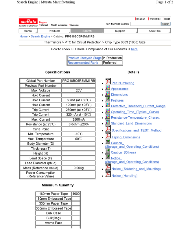 Thermistor PTC 6.8Ohm 20% 2-Pin 0603 Paper T/R