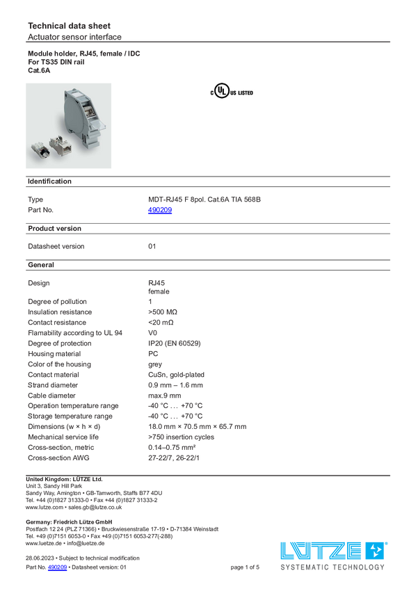 Lütze 490209 Wkładka złącza żeńskiego RJ45 MDT-RJ45 F 8pol. Cat.6A TIA 568B, piny: 8, 1 szt.