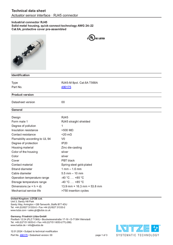 Lütze 490175 Złącze RJ45 RJ45-M 8pol. Cat.6A T568A, piny: 8, 1 szt.