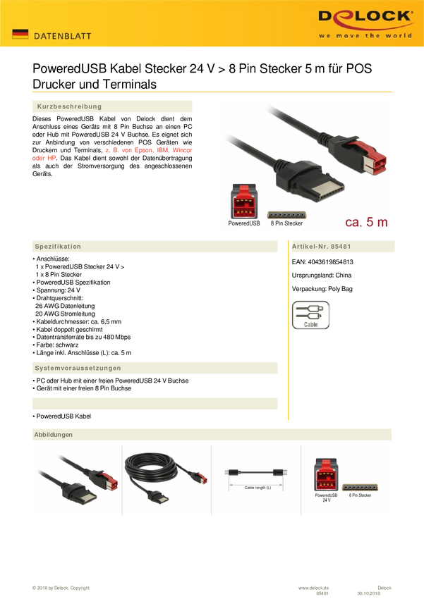 Delock Kabel USB USB 2.0 Wtyczka zasilania USB 24V, Wtyczka zasilania USB 24V 8pol. 5.00 m czarny 85481
