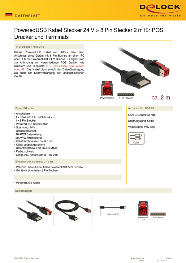 Delock Kabel USB USB 2.0 Wtyczka zasilania USB 24V, Wtyczka zasilania USB 24V 8pol. 2.00 m czarny 85478