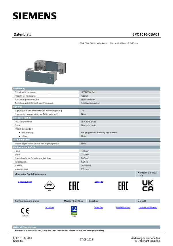 Podstawa narożników Siemens 8PQ1010-0BA04 1 szt.
