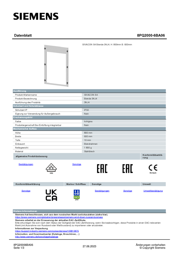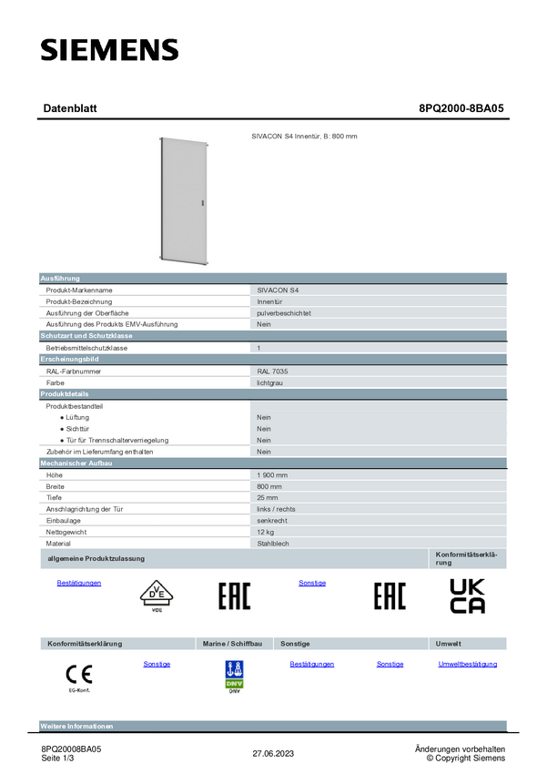 Drzwi wewnętrzne Siemens 8PQ2000-6BA05 1 szt.