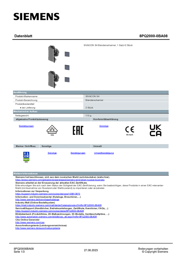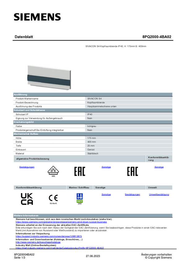 Przesłona Siemens 8PQ2000-4BA02 1 szt.