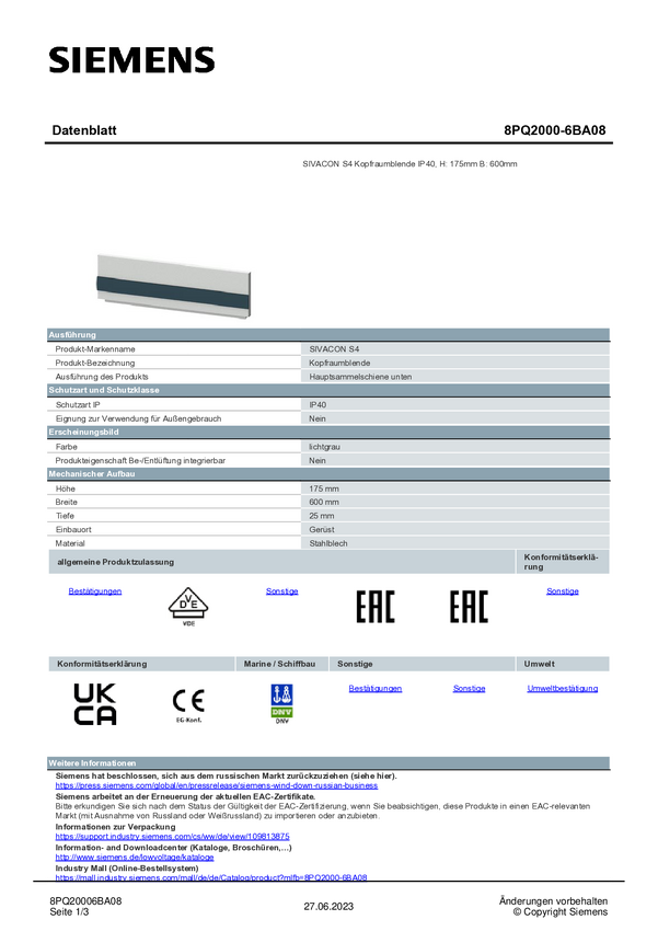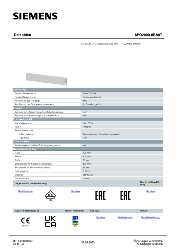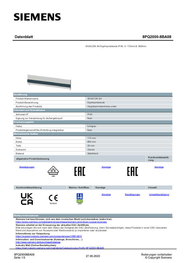 Przesłona Siemens 8PQ2000-6BA08 1 szt.