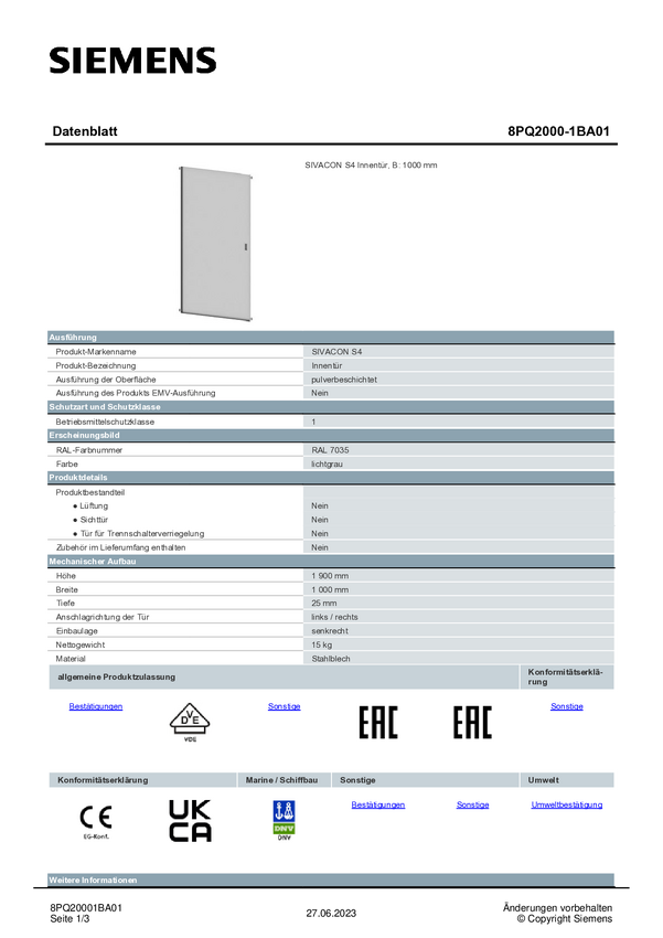 Drzwi wewnętrzne Siemens 8PQ2000-1BA01 1 szt.