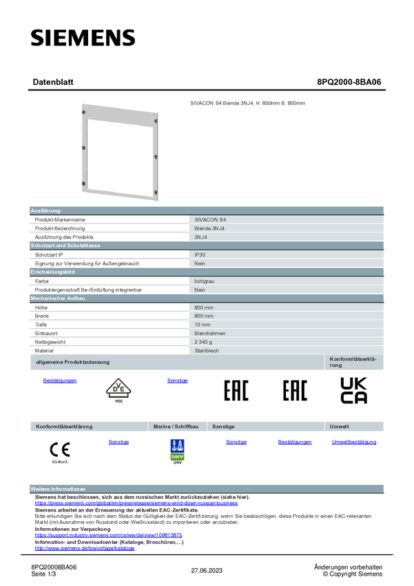Przesłona Siemens 8PQ2000-8BA06 1 szt.