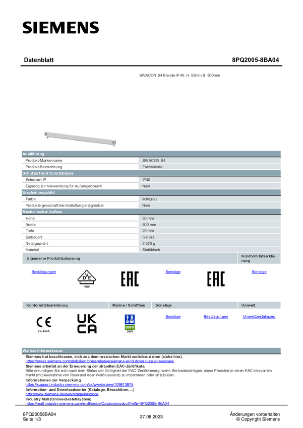 Przesłona Siemens 8PQ2005-8BA04 1 szt.