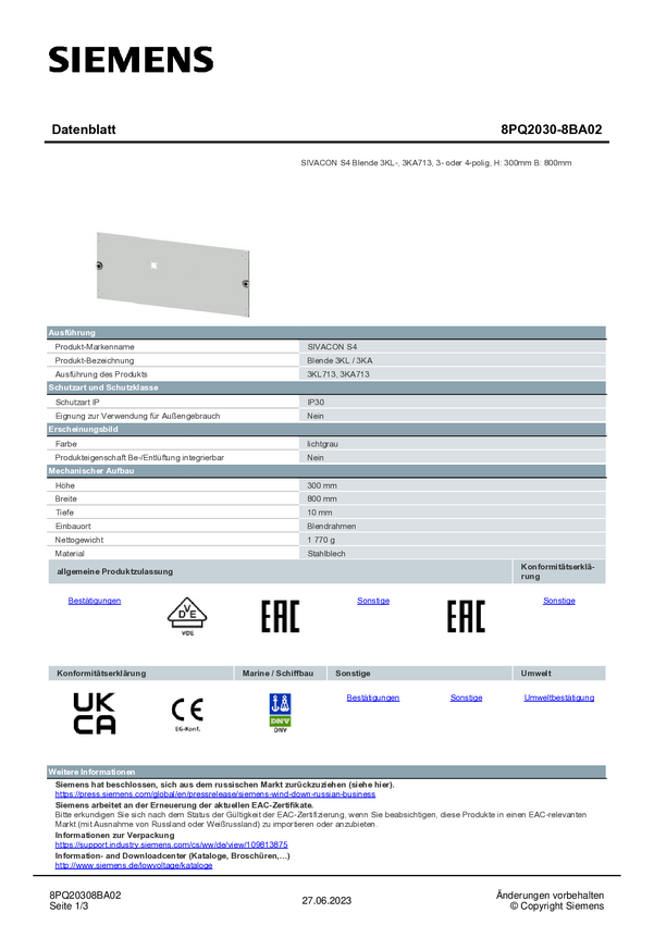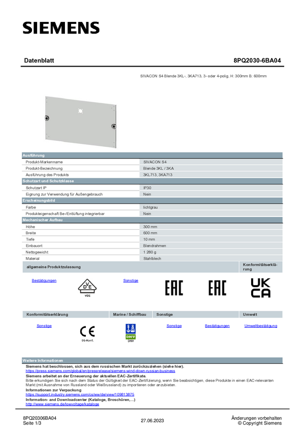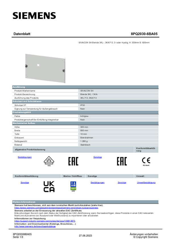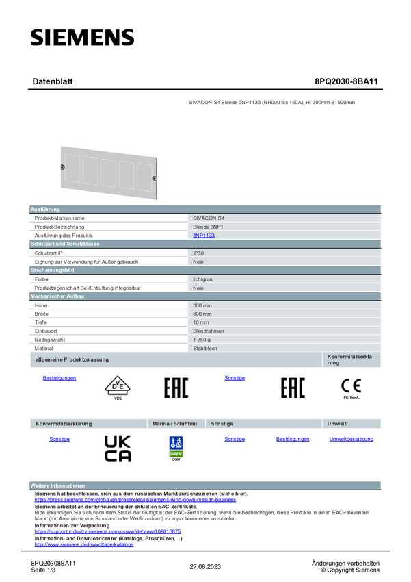 Przesłona Siemens 8PQ2030-6BA23 1 szt.