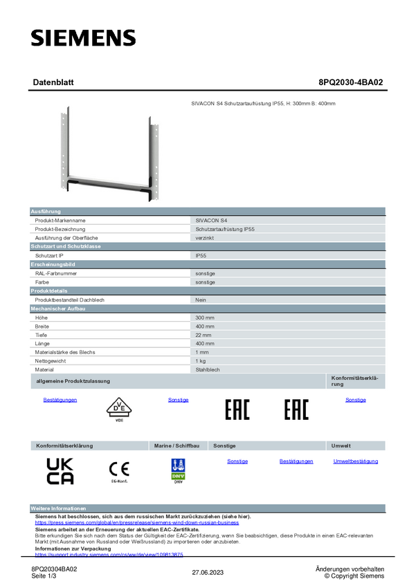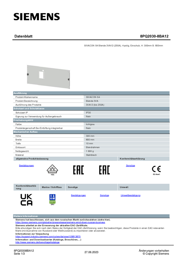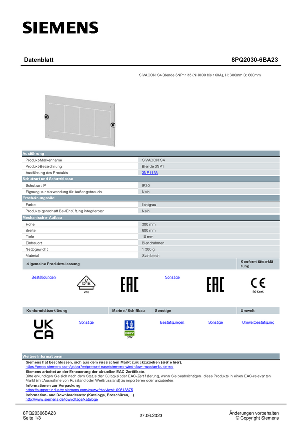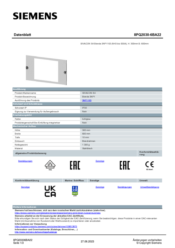 Drzwi półki Siemens 8PQ2030-4BA01 1 szt.