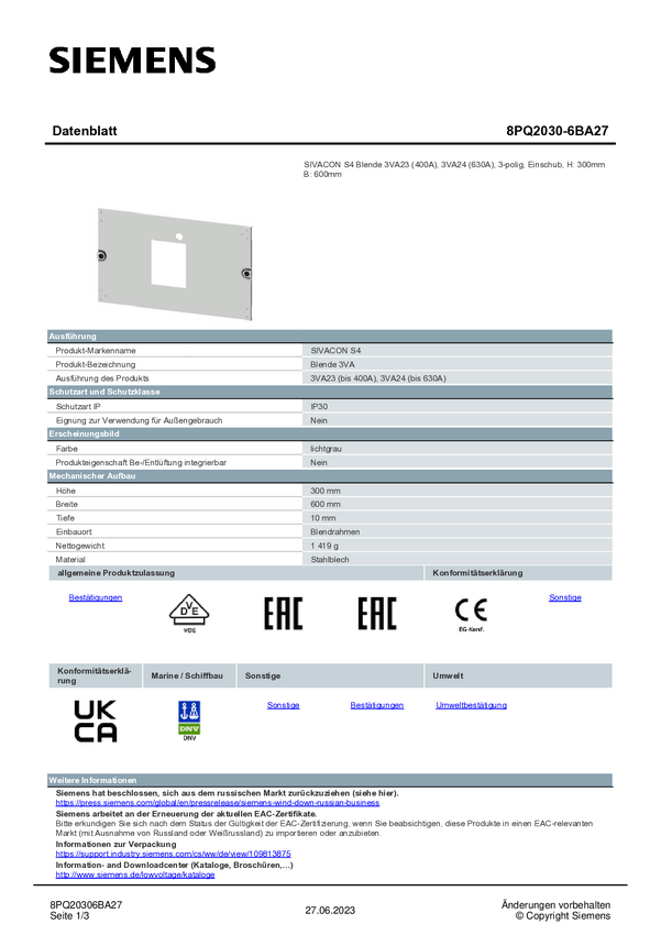 Przesłona Siemens 8PQ2030-6BA27 1 szt.
