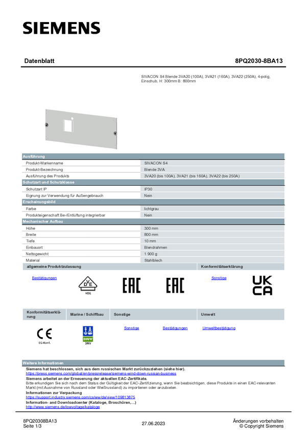 Przesłona Siemens 8PQ2030-6BA22 1 szt.