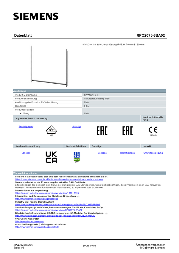 Aktualizacja typu ochrony Siemens 8PQ2075-6BA02 1 szt.