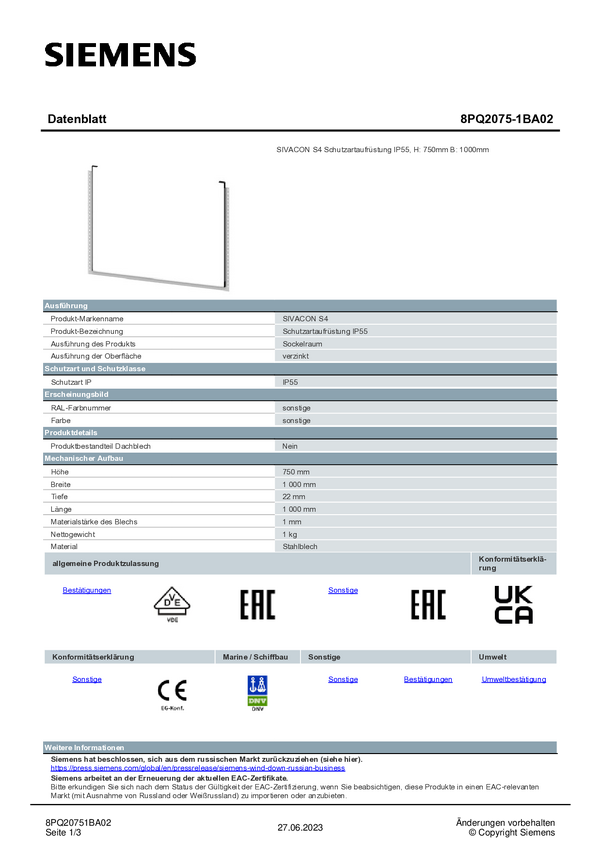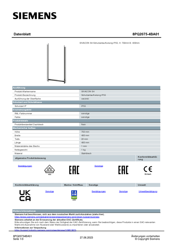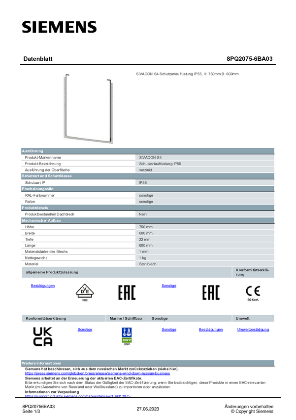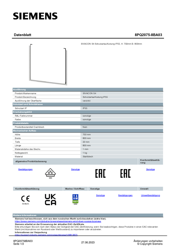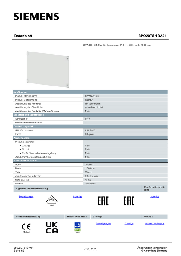 Drzwi półki Siemens 8PQ2075-1BA01 1 szt.