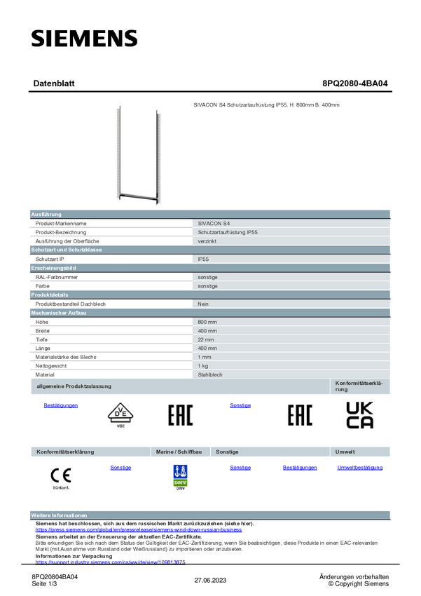 Aktualizacja typu ochrony Siemens 8PQ2080-8BA04 1 szt.