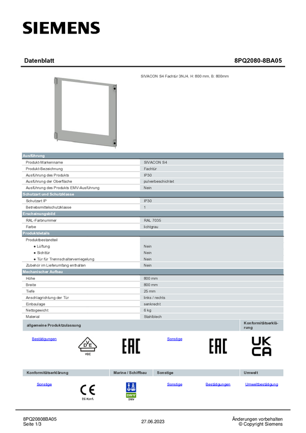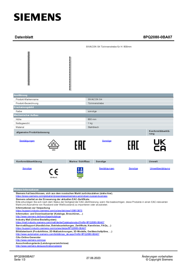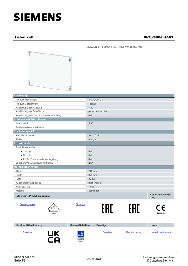 Drzwi półki Siemens 8PQ2080-4BA01 1 szt.
