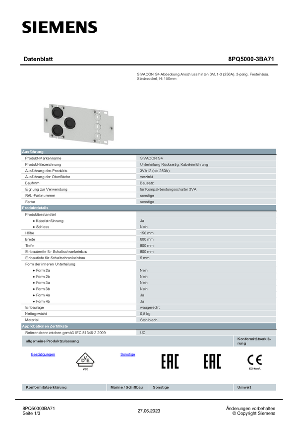 Pokrywa Siemens 8PQ5000-3BA71 1 szt.