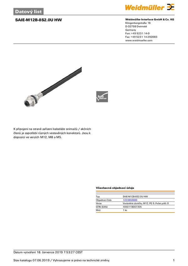 Złącze Weidmüller SAIE-M12B-8S2.0U HW 1223650000 1 szt.