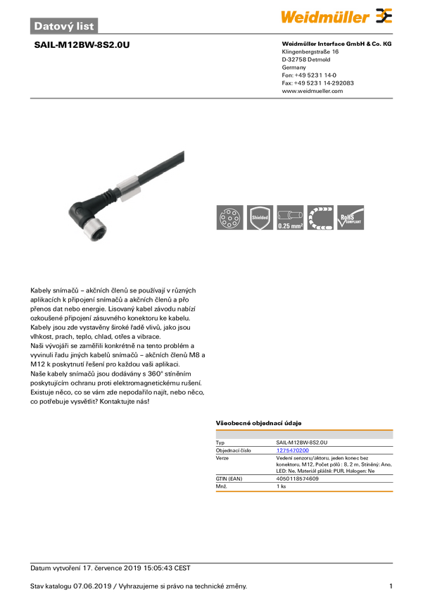 Weidmüller 1275470200 Złącze konfekcjonowane czujnika/aktuatora SAIL-M12BW-8S2.0U, piny: 8, 2.00 m, 1 szt.