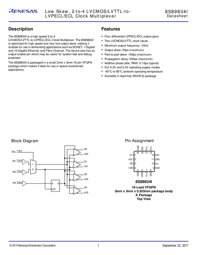 Low Skew,2-to-4 LVCMOS/LVTTL-to-LVPECL/ECL Clock Multiplexer
